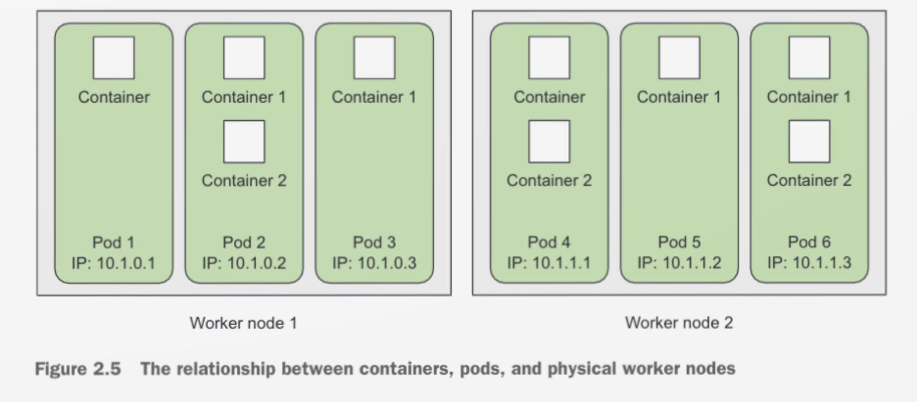 - 위의 그림과 같이 각각의 POD은 개별 IP, Hostname, Process를 가지고, 1개 이상의 Container를 구동시킨다.